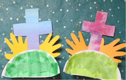 10 dakika – Elişi: Golgota Tepesinde Bir Umut Yükseliyor. Kağıt tabakları yarıdan kesin ve boyayın. Fon kağıtlarını üstüne ellerinizi koyup şeklini çıkartın sonra kesin ve tabağa yapıştırın. Haç şeklini de ekleyin. Bitti 🙂