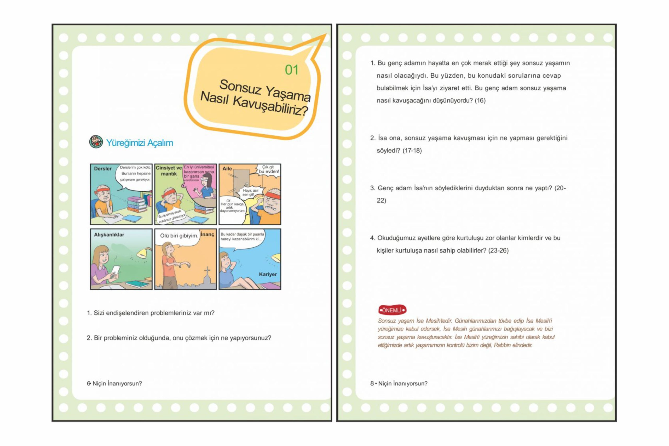 Kilisemizin geleceği olan gençlerimizi Rab’bin sözü ile yetiştirmemiz çok önemlidir. Bu kitap sadece kilisede değil; Ailemizde ve günlük hayatımızda da bütünleyici bir eğitim anlayışına odaklanmıştır. Gençlik dönemi çok önemlidir. Özellikle günümüzde insanların Tanrı bilgisinden uzaklaşmaya başladığı, bilim ve ekonomik kaygıların çoğaldığı bu zamanlarda gençlerimize ışık olacak kaynaklar değerlidir.